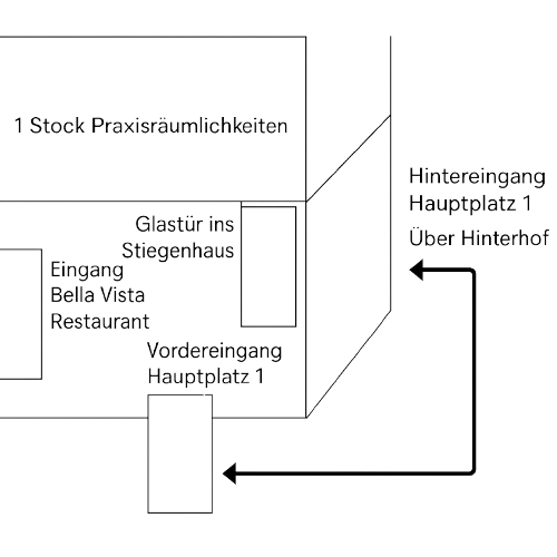 Nach dem Betreten teilt sich der Weg links gelangen Sie in die Pizzeria geradeaus führt eine Glas-Tür ins Stiegenhaus von dort geht es direkt in den 1. Stock zu unseren Praxisräumen.